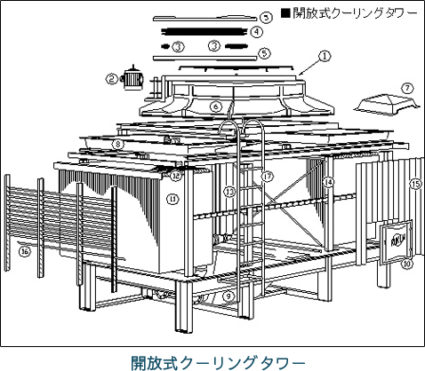 | 8 | 上部水槽 | 循環水(散布水)を均一にするための水槽です。蓋、歩廊等オプションも付けられます。 |