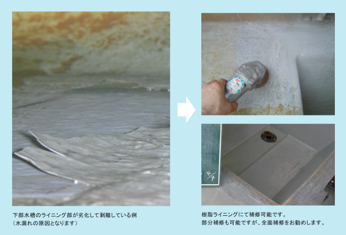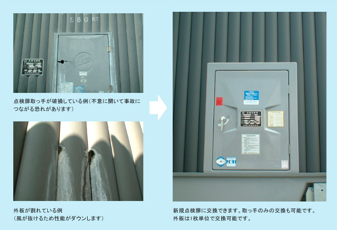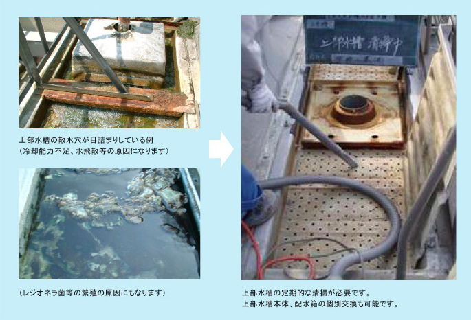 塔体各部も、破損や経年劣化が進んでしまいます。症状が進むと、冷却能力不足や事故につながる恐れがありますので、早目の処置が必要です。