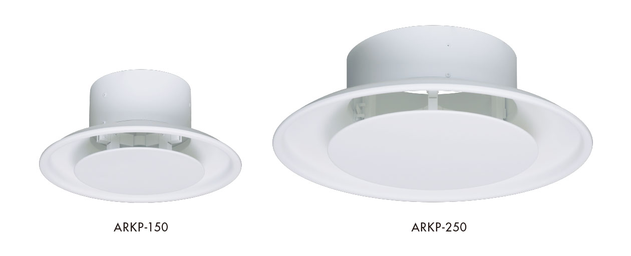 大ホールなどの大空間には吹出口の設置台数を減らしつつ風量処理が行える大きいサイズのφ250を、ミーティングスペースなどの小さな空間には気流の拡散性を上げるために小さいサイズのφ150を用います。また、φ250については既存のシーリングディフューザー等が使用されている商業設備の空調機器の更新時にもおすすめです。