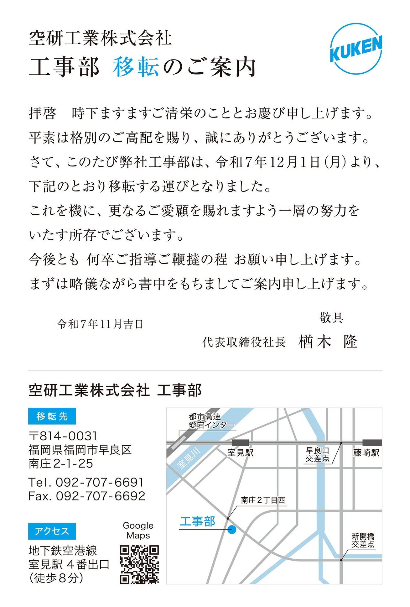 このたび、空研工業(株)は2025年12月1日より工事部を福岡市早良区南庄へ移転することとなりました。これを機に社員一同より一層精進してまいる所存でございます。今後とも、ご指導ご鞭撻を賜りますよう何卒宜しくお願い申し上げます。