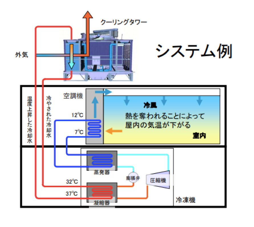 冷却塔は大気との熱交換を行 なっており、比較的大きな機械ですので、風通しの良 い開けた場所に設定してあり、ビルの屋 上などに設置されていることが多いです。