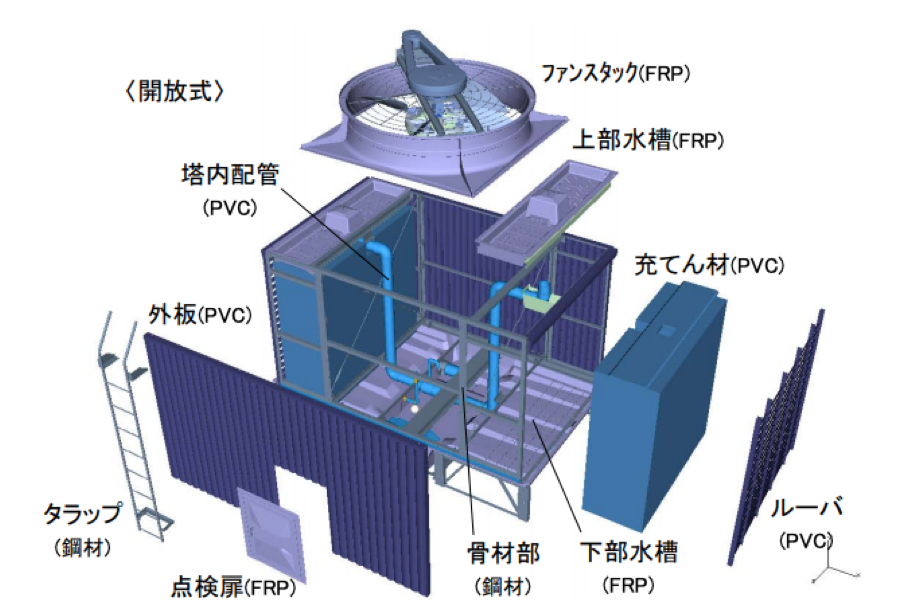 簡単でますが冷却塔の概要です。この他の 用途以外でも冷却塔を使用されることも増 えています。 一般的な「開放式」をはじめ、ランニングコス トに優れた「密閉式」、水を使用しない「空冷 式」、スカイツリーにも採用頂いた「密閉式冷 却塔兼加熱塔」など様々な製品の詳細は別 途カタログ等でご確認下さい。