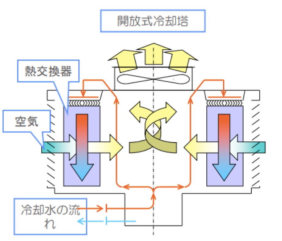 「開放式」 空気と水を直接接触させます。そのため冷却効 率が良く、冷却塔自体をコンパクトに納めること が出来ます。 半面、水が直接空気と触れるために汚れ易く、 冷凍機を含めたメンテナンスの頻度が増えます。