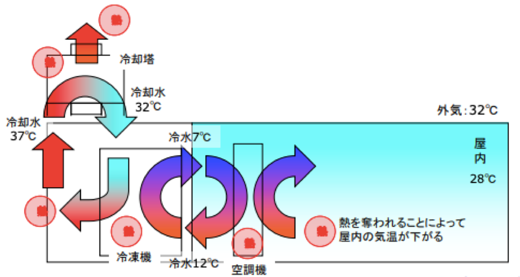 エアコンの室外機の様な役割で、 室内の熱を建物の外に放出するための設備です。 熱交換のための水を冷却塔内に 散水し大気と接触させることに よって、水の温度を下げています。