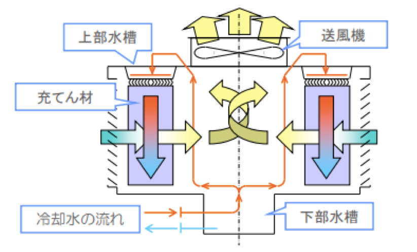 送風機で強制的に通風 し、水と空気を接触させ ることによって熱交換を します。 性能が安定し、設置面 積を小さく出来るため、 一般に使用されていま す。弊社の冷却塔はこちらを採用しています。